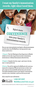 Most healthcare providers in Washington use the Washington Land Immunization Information System. Please check with your provider to ask if they can give you lot a complete immunization record for y'all or your kid. They can print information technology from the Immunization Information Arrangement or from their own medical record system.